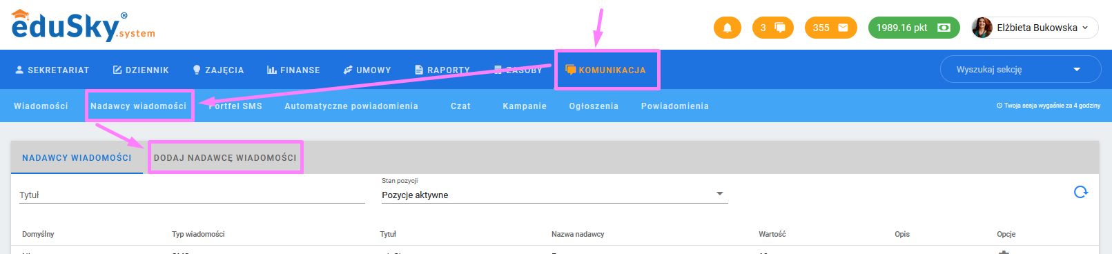 Aby dodać własną konfigurację skrzynki pocztowej przejdź do sekcji Komunikacja→ Nadawcy wiadomości → Dodaj nadawcę wiadomości.