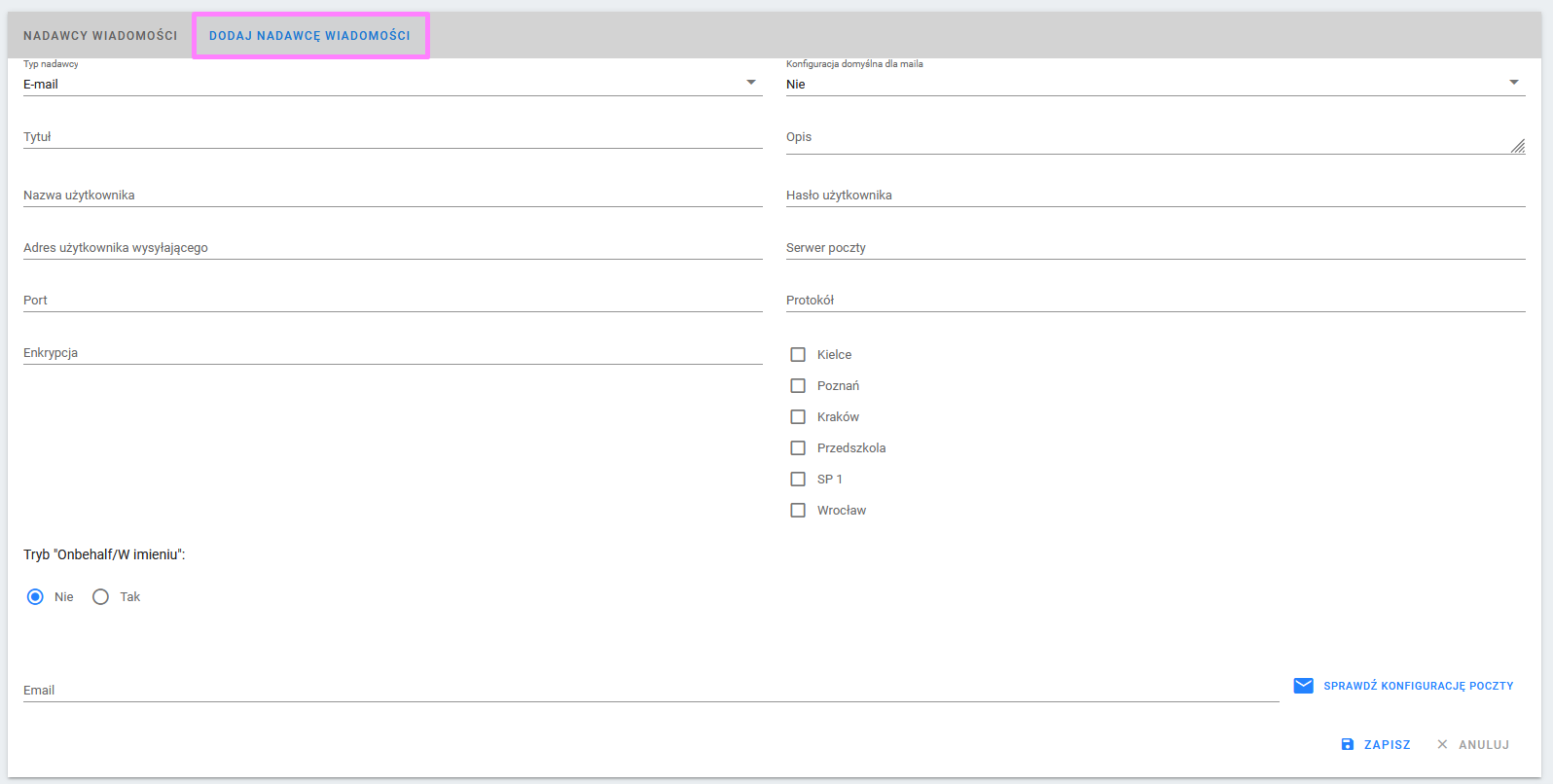 - Typ nadawcy – w tym polu wybierz opcję "e-mail"