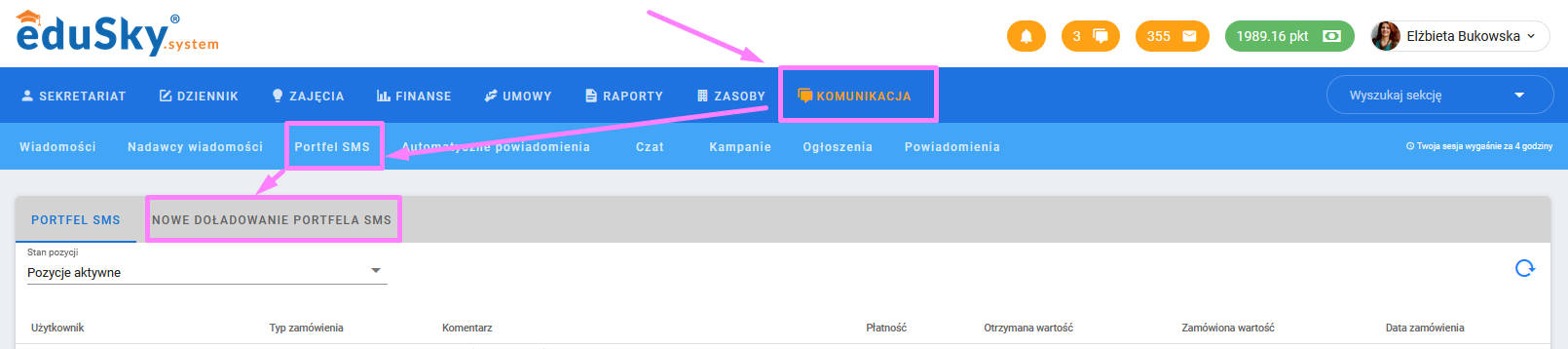 Doładowanie salda SMS odbywa się na zasadzie złożenia zamówienia wewnętrznego w systemie eduSky.